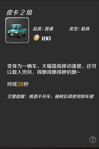 效果:变身为一辆车,大幅度提高移动速度,还可以载人兜风。